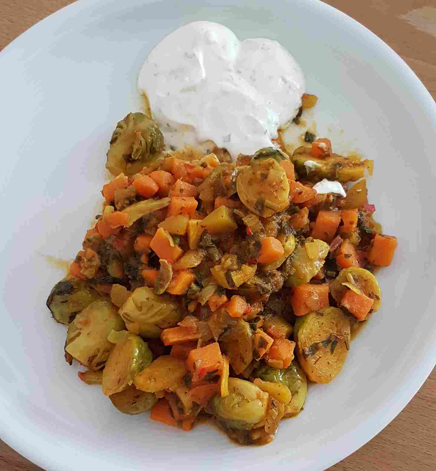 Alle Zutaten säubern, putzen und/oder schälen und in Stücke schneiden. DIe Chili in kleine Stückchen schneiden. Die Kurkumaknolle schälen und auf einer Reibe reiben. Die Zwiebel im Topf mit den Gewürzen andünsten und das Gemüse nach und nach zugeben.